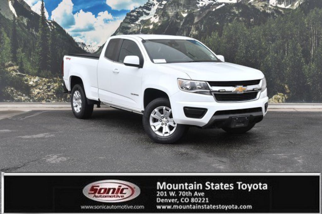 Come see this 2020 Chevrolet Colorado 4WD LT. Its Automatic transmission and Gas I4 2.5L/150 engine will keep you going. This Chevrolet Colorado has the following options: WHEELS, 17 X 8 (43.2 CM X 20.3 CM) BLADE SILVER METALLIC CAST ALUMINUM (STD), TRANSMISSION, 6-SPEED AUTOMATIC, HMD, 6L50 (STD), TIRES, 255/65R17 ALL-SEASON, BLACKWALL (STD), TIRE, COMPACT SPARE T175/90D18, BLACKWALL (STD), SUMMIT WHITE, SEATS, FRONT BUCKET (STD), REAR PARK ASSIST, ULTRASONIC, REAR AXLE, 4.10 RATIO, LT PREFERRED EQUIPMENT GROUP includes standard equipment, and LICENSE PLATE KIT, FRONT. Stop by and visit us at Mountain States Toyota, 201 W 70th Ave, Denver, CO 80221.